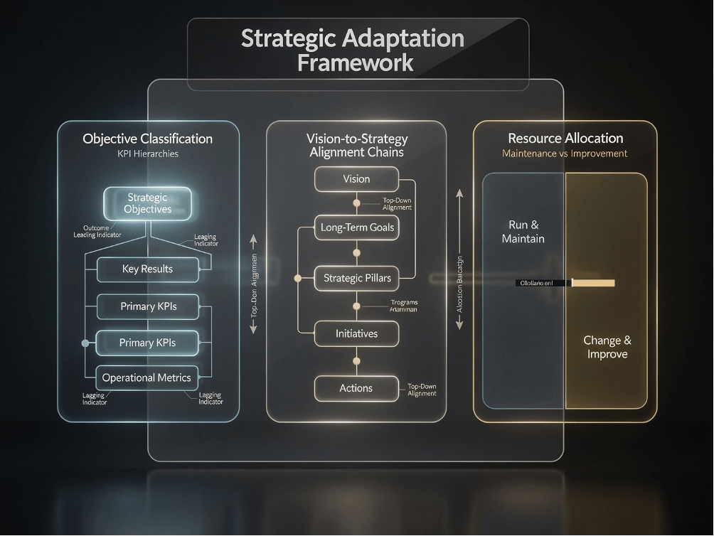 Adattamento #2: Ancorare ogni OKR alla catena Vision → Mission → CSF → Obiettivo Strategico. Un OKR che non sa a quale Fattore Critico di Successo risponde è un obiettivo ambizioso senza bussola. Prima di scrivere un Objective, la domanda da porsi è duplice: a quale CSF risponde? E qual è l’Obiettivo Strategico pluriennale di cui questo OKR è il prossimo ciclo esecutivo? Questo ancoraggio è ciò che distingue un sistema OKR coerente da una lista di aspirazioni trimestrali ben scritte ma sconnesse.