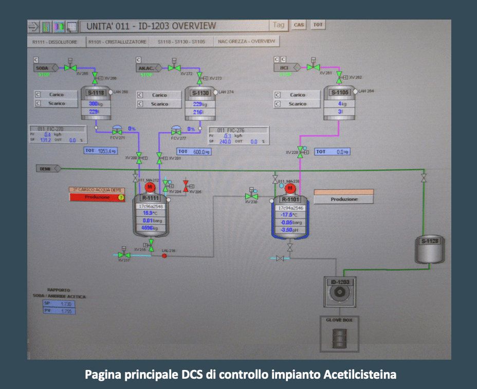 Sono gestiti dalle sequenze impostate nel sistema di controllo i passaggi di fase della lavorazione, i trasferimenti (in controllo di pressione di azoto) del prodotto tra le diverse apparecchiature, nonchè la gestione del carico nei reattori dell’acqua demineralizzata e dei reagenti liquidi, tramite opportuni serbatoi di dosaggio dotati di celle di carico e misuratori massici dei quantitativi trasferiti, con reintegro automatico del livello. L’implementazione del sistema di automazione ha permesso, inoltre, di ridurre al minimo le operazioni manuali da eseguire in campo.