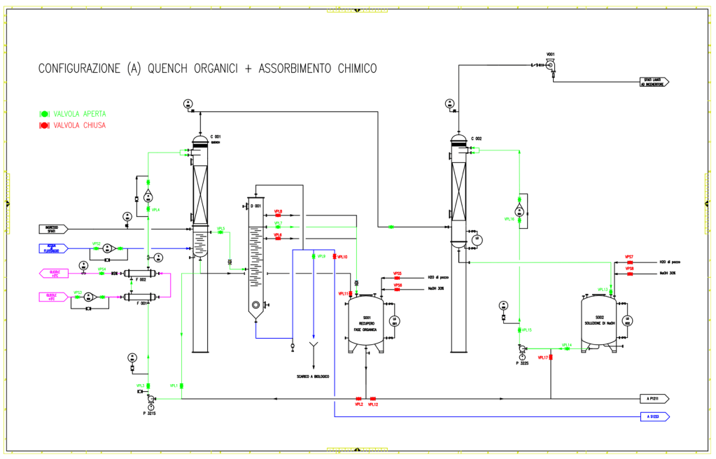 La prima configurazione prevede di utilizzare la colonna C001 come quench degli sfiati in ingresso con lo scopo di abbattere parzialmente i composti organici che vengono poi separati nel successivo separatore D001 e raccolti nel serbatoio di stoccaggio S001; il quench è effettuato con acqua di pozzo che viene raffreddata da due scambiatori F001 e F002 in serie, alimentati ad acqua glicolata a +5°C, prima di rientrare in testa alla colonna C001.